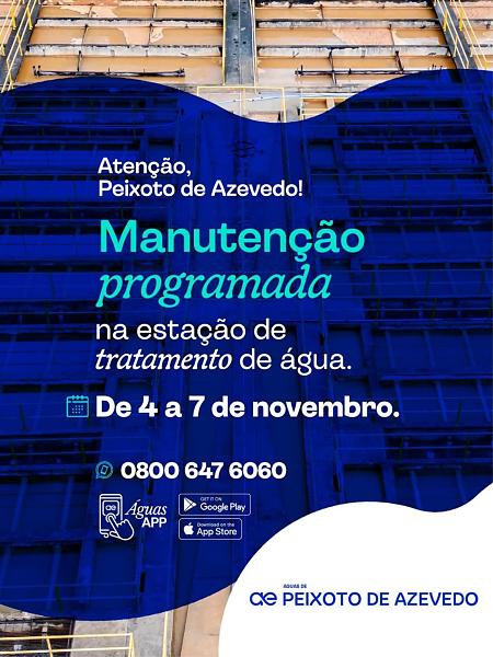 A Águas de Peixoto de Azevedo realiza, entre os dias 4 e 7 de novembro, uma manutenção programada na Estação de Tratamento de Água (ETA). A ação faz parte do ciclo de manutenções preventivas que vêm sendo executadas pela concessionária, com foco na modernização do sistema e no aprimoramento da qualidade da água distribuída à população.