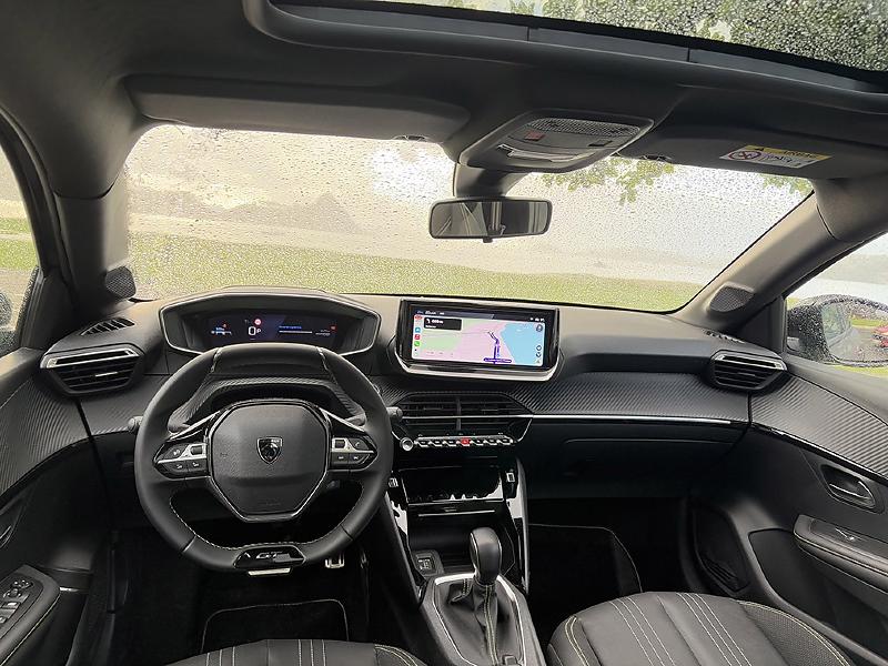 O habitáculo é marcado pelo conceito i-Cockpit 3D, com um volante pequeno para que o painel seja olhado por cima do volante. Isso obriga uma posição de banco mais alta, com rebaixamento do volante, que já é pequeno demais. Não é a combinação mais ergonômica. Além disso, os famigerados comandos satélites – para controle de cruzeiro à esquerda e do som à direita – se escondem atrás dos raios do volante.